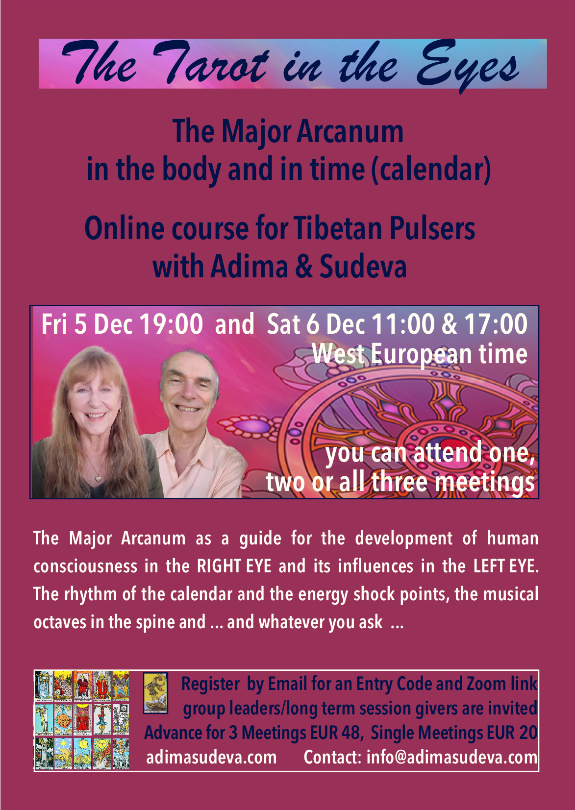 We will introduce, refresh and discuss the Major Arcanum as a guide for the development of human consciousness in the RIGHT EYE and its influences in the LEFT EYE. The Rhythm of the Calendar and the occurrence of ESP (Energy Shock Points) ... The musical octaves in the spine and the Tonal Frequencies between the opposites and the complementaries ... and whatever you ask about the Tarot in the Eyes and the Calendar (Chieh-Chi) ...