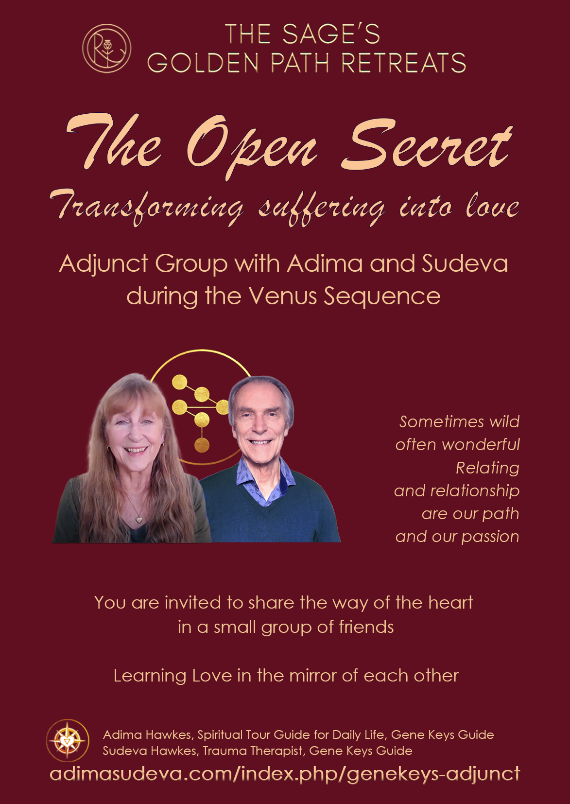The celestial sounds have just begun composing a song that pulls the heart into a dance of rainbow sparkling magical connections. We anticipate this will be an epic, magical journey into truth, love and wisdom, best encountered without expectations. Whatever one believes to "know" from the past - about oneself or the Gene Keys or anything else for that matter - this is a fresh opening into the great change. Sudeva and Adima will participate as Gene Keys Guides and also contribute to the journey with Adjunct Groups.