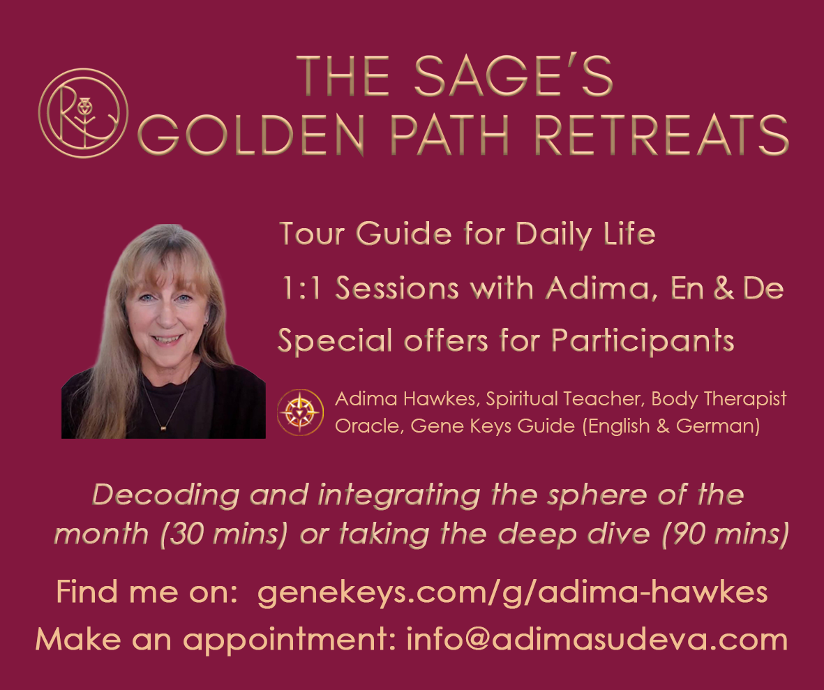 The celestial sounds have just begun composing a song that pulls the heart into a dance of rainbow sparkling magical connections. We anticipate this will be an epic, magical journey into truth, love and wisdom, best encountered without expectations. Whatever one believes to "know" from the past - about oneself or the Gene Keys or anything else for that matter - this is a fresh opening into the great change. Sudeva and Adima will participate in the full journey and contribute as Gene Keys Guides with Adjunct Groups and Sessions.